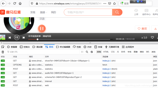 在喜馬拉雅網(wǎng)站上,隨便點(diǎn)開(kāi)一個(gè)音頻,打開(kāi)“開(kāi)發(fā)者工具”,再點(diǎn)擊播放按鈕,可以看到出現(xiàn)了多個(gè)請(qǐng)求: