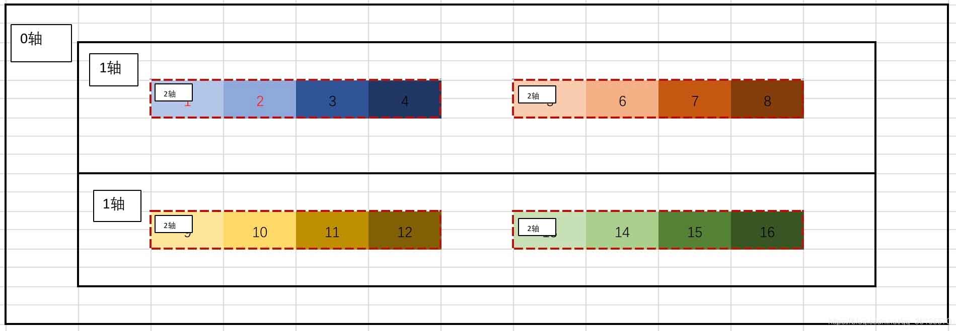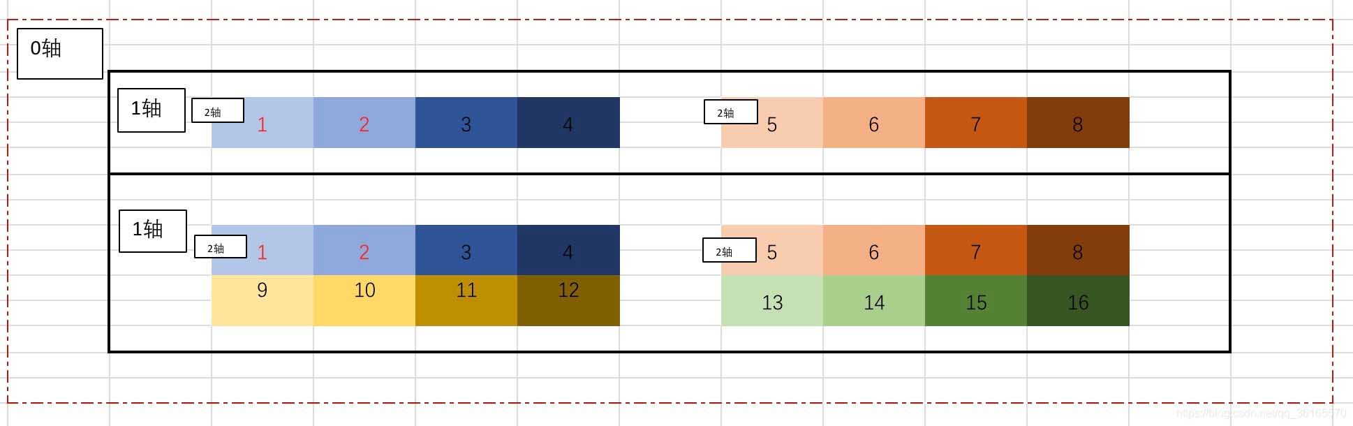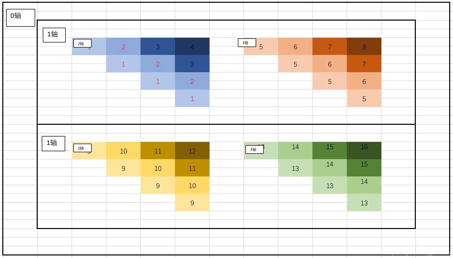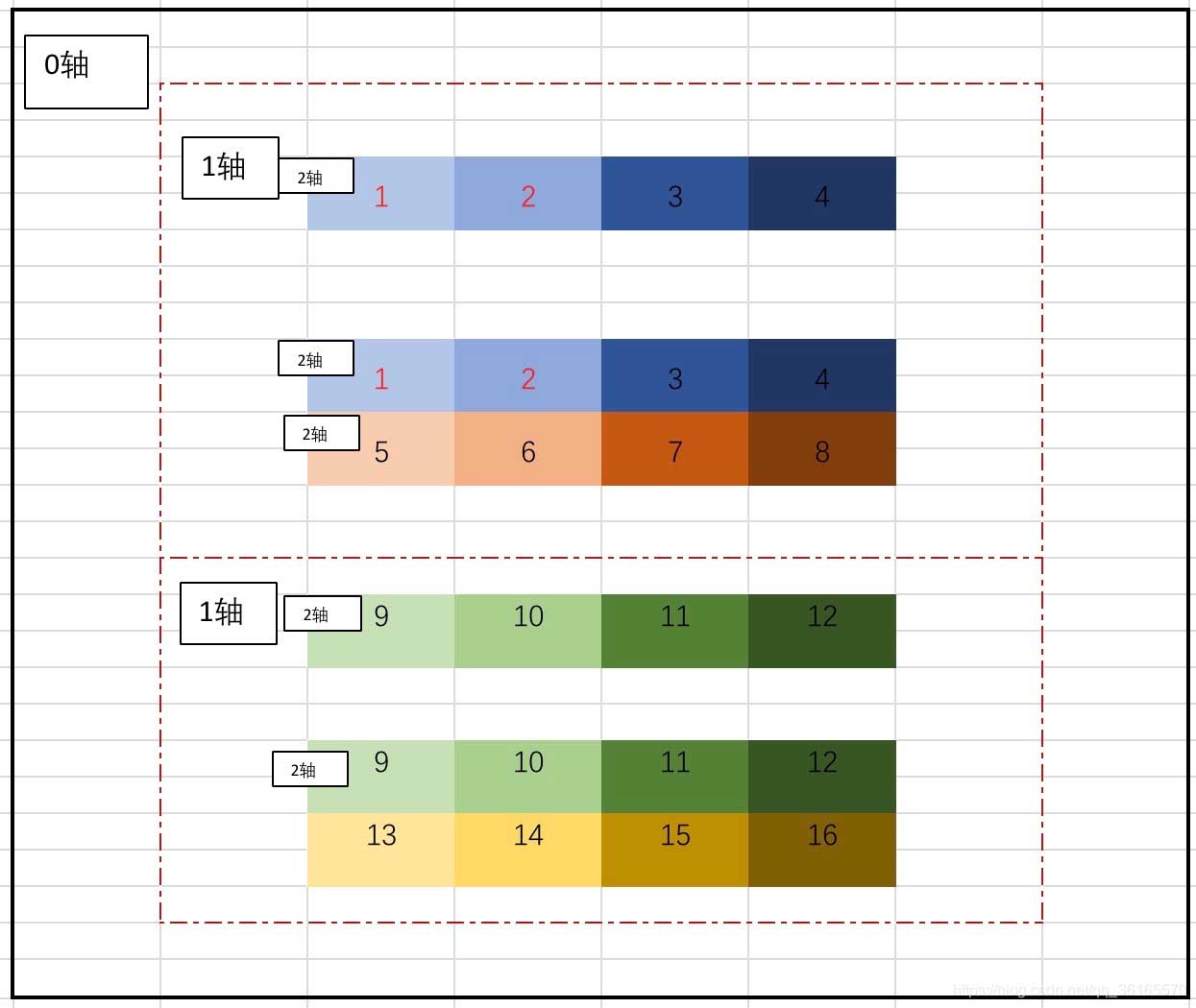 老規(guī)矩:紅色虛線表示沿著2軸進行累加,所以應(yīng)該是1,2,3,4進行累加,5,6,7,8進行累加,依次類推