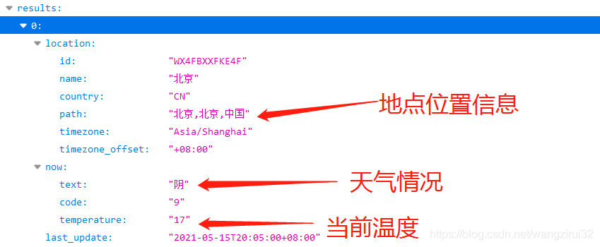 在文檔中,可以看到查詢的API網(wǎng)址,接下來,把url中的參數(shù)key改為你的密鑰,訪問,返回的json數(shù)據(jù):