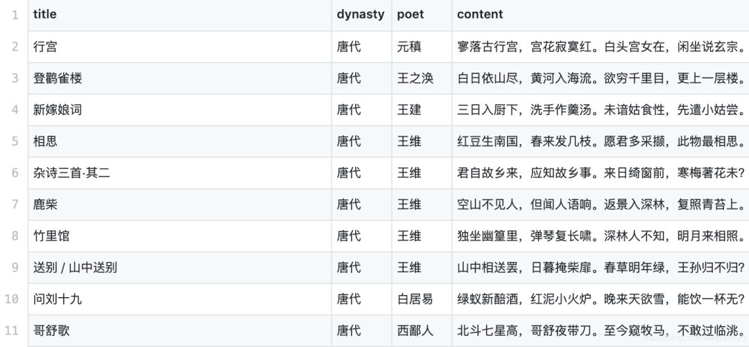 本項目的示例數(shù)據(jù)為poem.csv,下圖為該數(shù)據(jù)集的前十行: