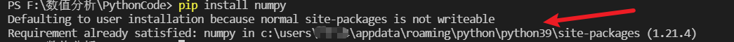 python庫是否安裝成功,可以到如下pip默認安裝路徑查看C:\Users\你的用戶名\AppData\Roaming\Python\Python39\site-packages,實在不行,就使用pip install numpy命令,如果安裝成功會顯示安裝成功的路徑,如下圖