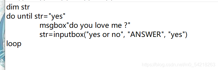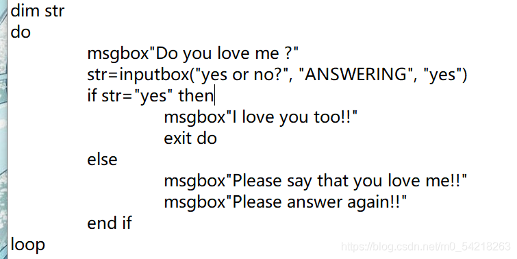 str=msgbox("Do you love me ?", vbYesNo, "LOVE")