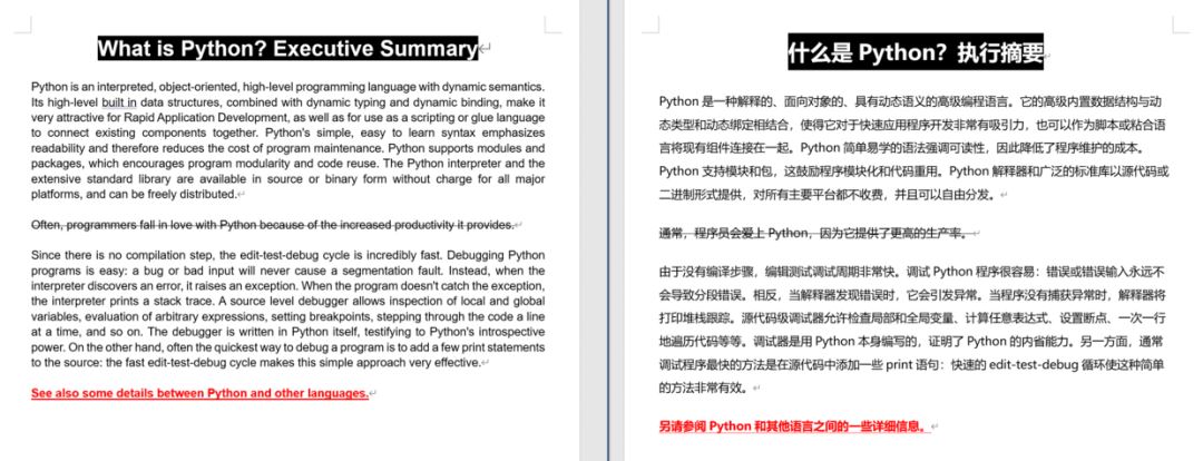 本文將給大家分享一個(gè)實(shí)用的Python辦公自動(dòng)化腳本 「利用Python批量翻譯英文Word文檔并保留格式」,最終效果甚至比部分收費(fèi)的軟件還要好!先來(lái)看看具體的工作內(nèi)容。