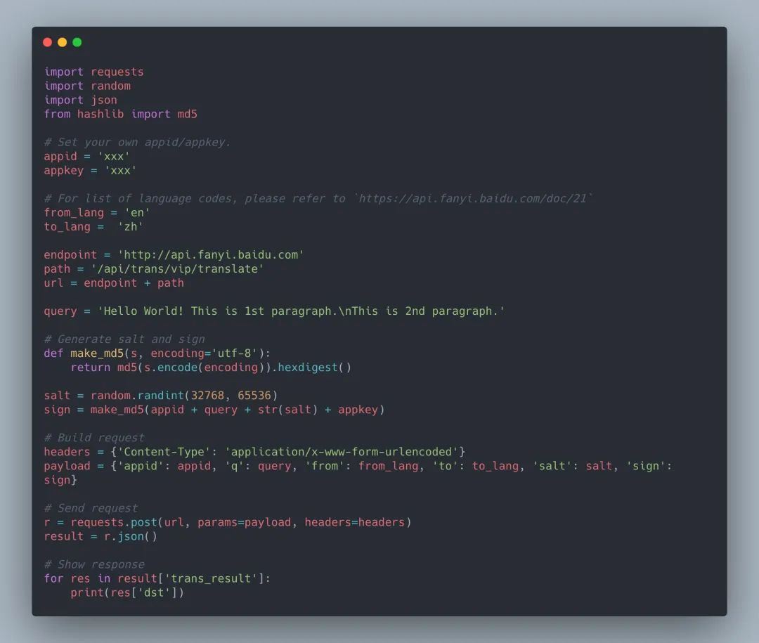 完成后在個(gè)人頁(yè)面在即可看到 ID 和密鑰,這個(gè)很重要!下面給出整理好的通用翻譯 API 的 demo,已經(jīng)對(duì)輸出做簡(jiǎn)單修改,代碼拿走就能用!