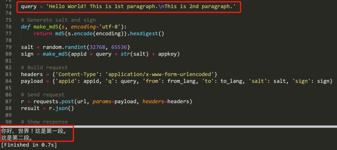 可以看到,測(cè)試內(nèi)容準(zhǔn)確的被翻譯出來(lái),注意如果需要多次訪問(wèn) API,免費(fèi)版有并發(fā)數(shù)和時(shí)間限制,可以用 time 模塊睡眠一秒
