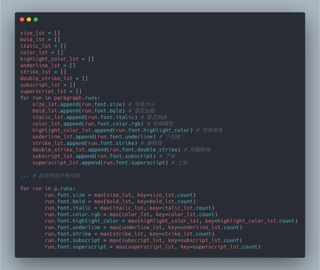 對(duì)于字號(hào)、加粗、斜體、顏色等樣式調(diào)整,采取的策略是建立空列表,遍歷原文檔每一段每一個(gè)文字塊,獲取相應(yīng)屬性并放到各自的列表中,對(duì)同一段而言,其包含的文字塊屬性最多的選項(xiàng)賦值給翻譯后文檔的對(duì)應(yīng)段落(如同一段全部或大部分的文字是加粗,則翻譯后對(duì)應(yīng)段落所有文字塊均設(shè)置為加粗) 對(duì)NLP感興趣的讀者可自行嘗試如何高度還原英文文檔中某些特定詞語(yǔ)的樣式修改,并在翻譯后的文檔中體現(xiàn)出來(lái)