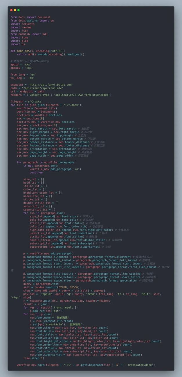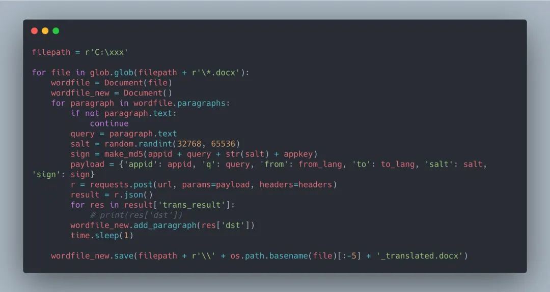導(dǎo)入需要的模塊,除翻譯 demo 中需要的庫(kù)外還需要 glob 庫(kù)批量獲取文件、python-docx 讀取文件、time 模塊控制訪問(wèn)并發(fā)。為什么要 os 模塊見(jiàn)下文: