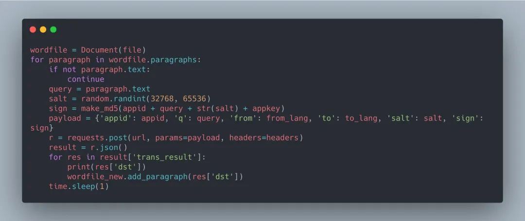 python-docx完成 Word 文件實(shí)例化后對(duì)段落進(jìn)行解析 - 解析出的段落文本交給百度通用翻譯 API,解析返回的 Json 格式結(jié)果(上面的修改 demo 中已經(jīng)完成了這一步)并重新寫入新的文件