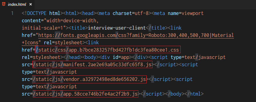查看了一下打包后的 index.html 源碼,終于發(fā)現(xiàn)了一個(gè)重要的點(diǎn):