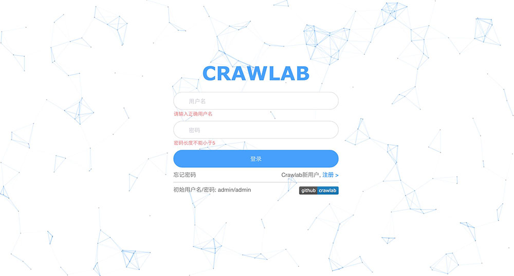 初始登陸用戶名密碼是 admin/admin,您可以使用這個用戶名密碼來登陸。如果您的環(huán)境變量CRAWLAB_API_ADDRESS設置得不正確,您可能會看到點擊登陸后登陸按鈕會一直轉圈而沒有任何提示。這時請重新在docker-compose.yml中設置正確的CRAWLAB_API_ADDRESS(將localhost替換為<your_ip>),重新啟動docker-compose up。然后在瀏覽器中輸入http://<your_ip>:8080。