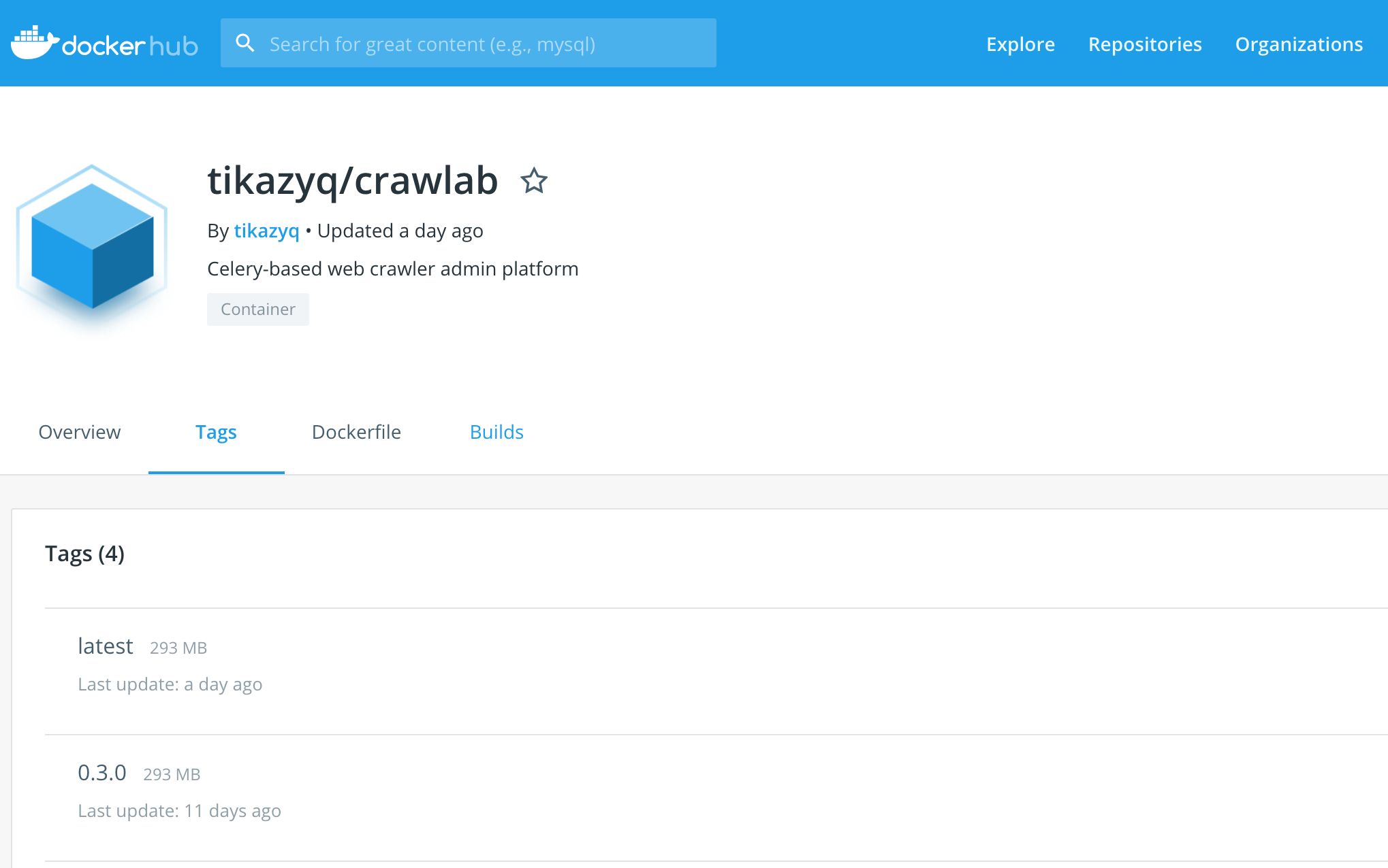 讀者可以去 Dockerhub 上查看 Crawlab 的鏡像,只有僅不到 300Mb。地址:https://hub.docker.com/r/tikazyq/crawlab/tags