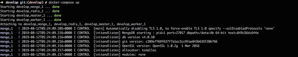 運行上述命令后,Docker Compose 會去拉取 MongoDB 和 Redis 的鏡像,這可能會花幾分鐘時間。拉取完畢后,四個服務會依次啟動,您將會在命令行中看到如下內(nèi)容。