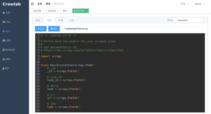 可以在爬蟲詳情中點擊“文件”標簽,選擇一個文件,可以在文件中編輯代碼。