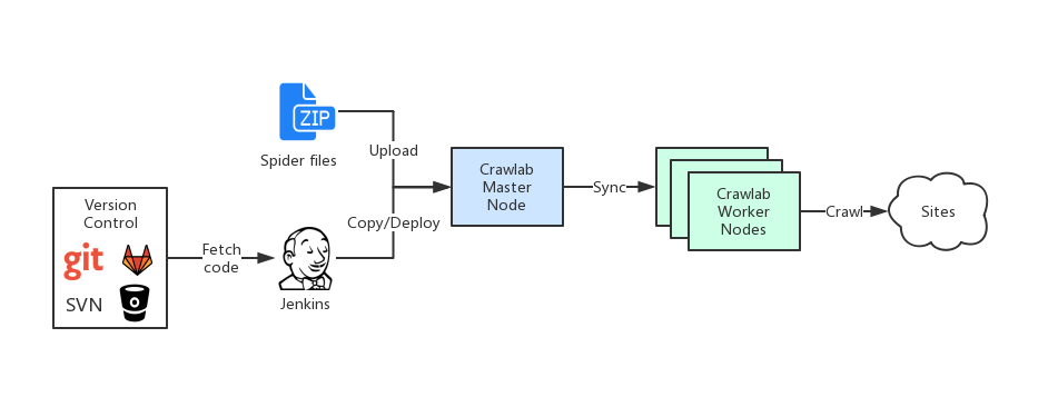 當我們更新了代碼,我們需要將更新后的代碼發(fā)布到線上服務器。這時您需要用自己寫部署腳本,或者更方便的,用 Jenkins 作為持續(xù)集成(Continuous Integration)管理平臺。Jenkins 是一個持續(xù)集成平臺,可以通過獲取版本庫來更新部署代碼,是非常實用的工具,在很多企業(yè)中都有用到。下圖是如何將 Crawlab 爬蟲應用到持續(xù)集成工作流程中的例子。