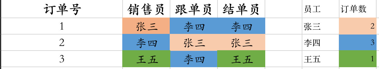 - 李四:參加了訂單號(hào)1-跟單員、結(jié)單員,訂單2-銷(xiāo)售員,訂單號(hào)3-跟單員,數(shù)量3