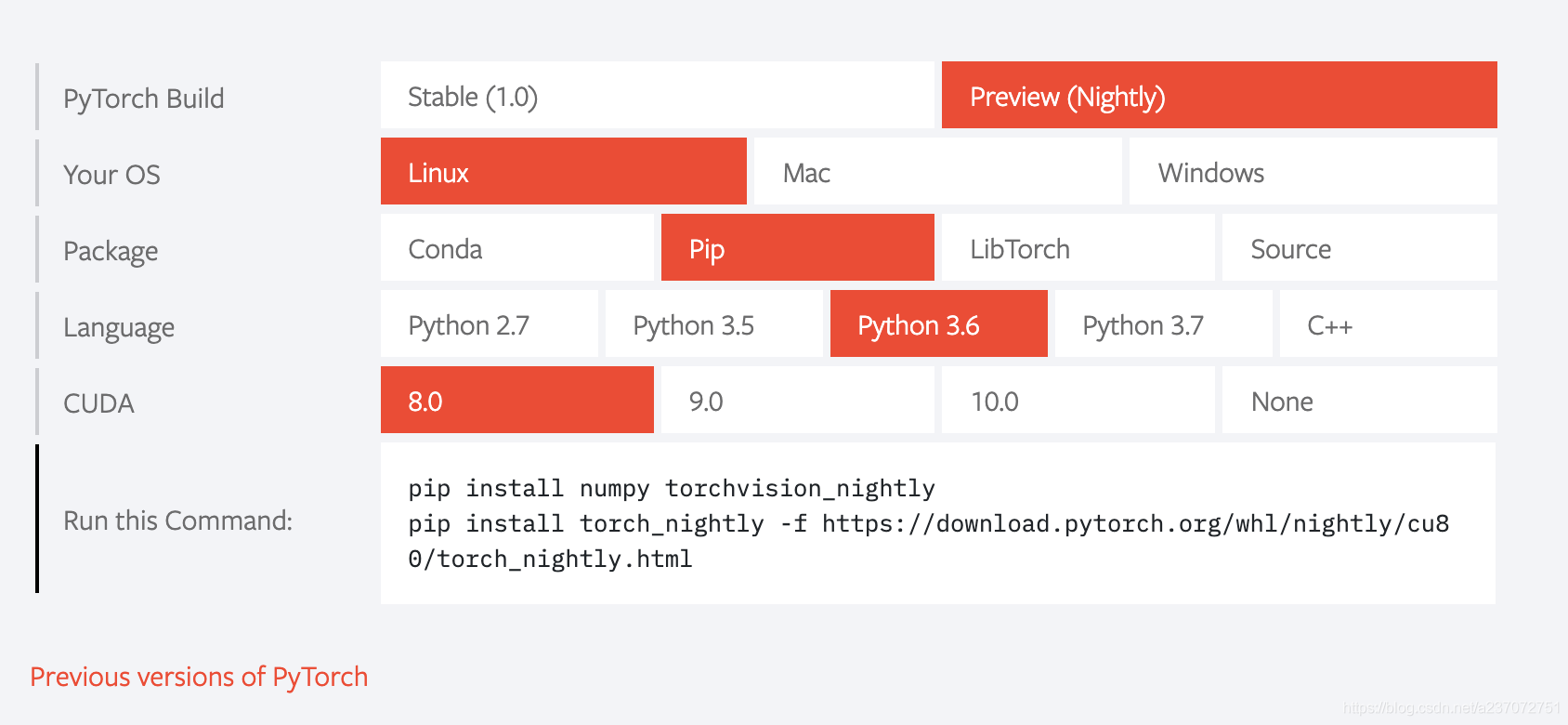 以安裝pytorh-nightly, cuda80, linux系統(tǒng)為例。