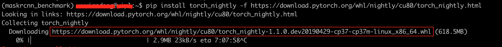 第二條為安裝pytorch對(duì)應(yīng)的命令,直接執(zhí)行安裝速度很慢。這里我們可以采用預(yù)先下載安裝包的方式安裝pytorch。