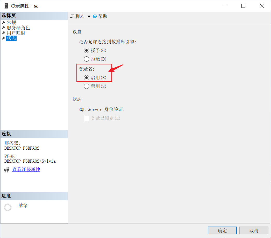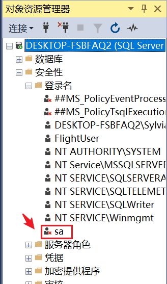 打開sql server management studio,點(diǎn)擊安全性,點(diǎn)擊登錄名,如果sa項(xiàng)出現(xiàn)紅色的×則說明sa用戶登錄未啟用,右鍵sa點(diǎn)擊屬性,點(diǎn)擊狀態(tài)即可啟用。