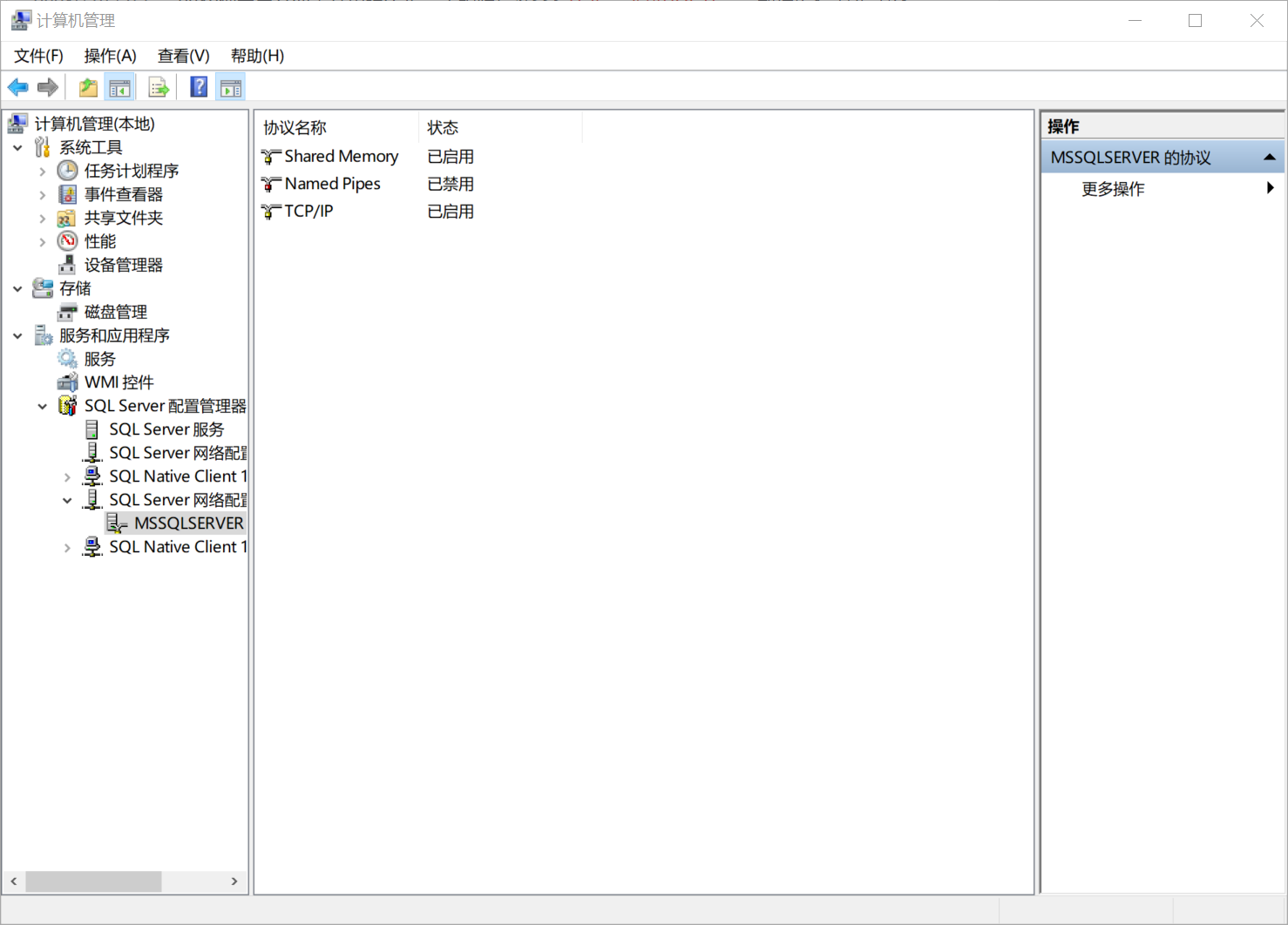 2.tcp/ip協(xié)議未開啟,這個(gè)位于(右鍵此電腦,點(diǎn)擊管理,點(diǎn)擊服務(wù)與應(yīng)用程序,點(diǎn)擊sql配置管理器,點(diǎn)擊sql server網(wǎng)絡(luò)配置,點(diǎn)擊mssqlserver的協(xié)議,右鍵tcp/ip,點(diǎn)擊啟用,重啟電腦后才會(huì)生效)