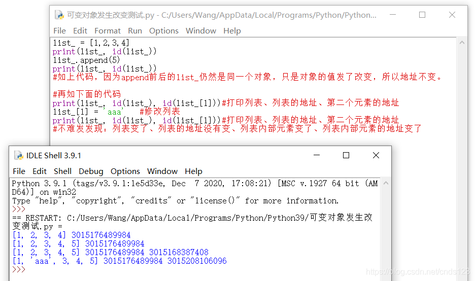 list_ = [1,2,3,4] print(list_, id(list_)) list_.append(5) print(list_, id(list_)) #如上代碼,因為append前后的list_仍然是同一個對象,只是對象的值發(fā)了改變,所以地址不變。 #再如下面的代碼 print(list_, id(list_), id(list_[1]))#打印列表、列表的地址、第二個元素的地址 list_[1] = 'aaa'#修改列表 print(list_, id(list_), id(list_[1]))#打印列表、列表的地址、第二個元素的地址 #不難發(fā)發(fā)現(xiàn):列表變了、列表的地址沒有變、列表內(nèi)部元素變了、列表內(nèi)部元素的地址變了