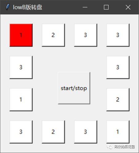 下面就用Tkinter定義界面控件,實(shí)現(xiàn)一個(gè)簡單的輪盤抽獎(jiǎng)游戲界面的設(shè)計(jì),然后就進(jìn)行游戲抽獎(jiǎng),如下所示: