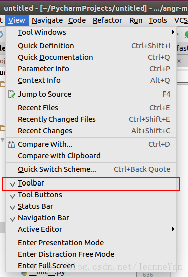 一款對(duì)瀏覽代碼功能支持良好的IDE一般Toolbar上都有按鈕或者會(huì)有快捷鍵可以在歷史瀏覽頁面之間跳轉(zhuǎn)。而我的Pycharm的默認(rèn)設(shè)置一直是將Toolbar隱藏起來的。
