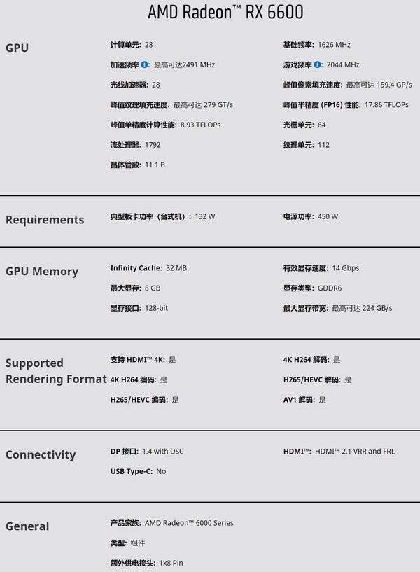 6600與6600xt一樣,采用了Navi 23 XL的核心,流處理器數(shù)量1792個(gè),現(xiàn)在已經(jīng)確認(rèn)了是8G GDDR6顯存,32MB無(wú)線緩存,依然是128bit的位寬。