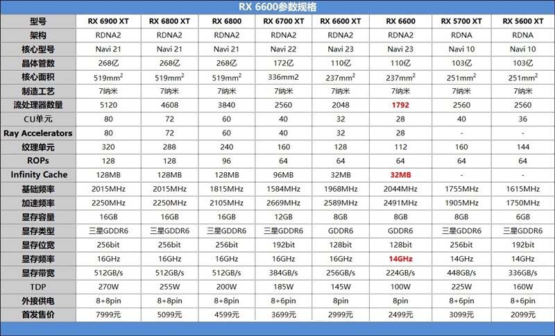 RX 6600與RX 6600 XT一樣,采用了更小的Navi 23核心,不過在規(guī)格方面做了一些閹割。1792個流處理器、28個Ray Accelerators光追單元、14GHz顯存頻率這些和RX 6600 XT相比,正好都縮減了1/8。另外64個ROP單元與32MB Infinity Cache都保持原樣。
