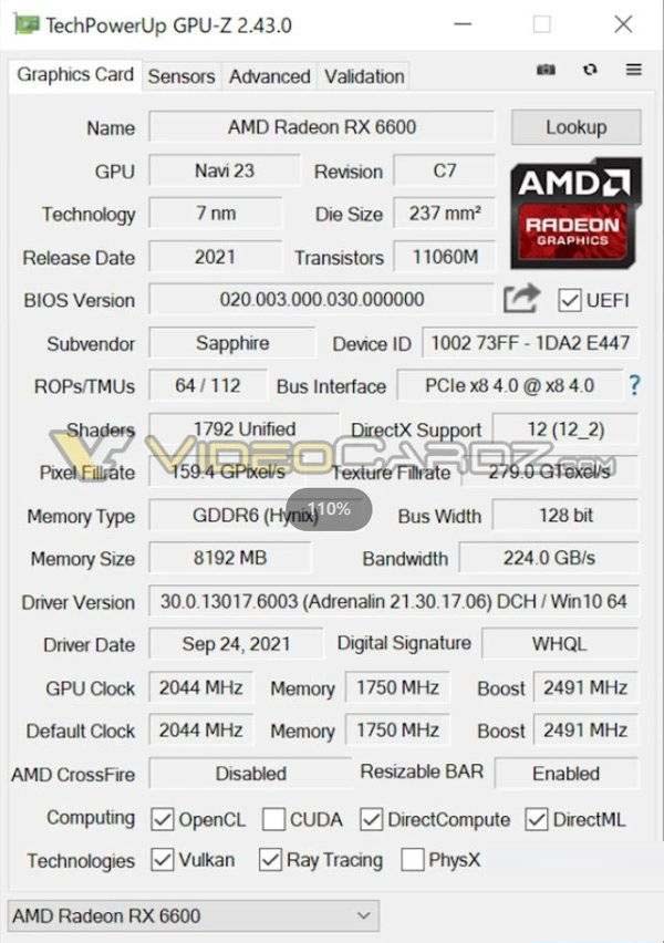 RX 6600具有1792個(gè)流處理器,默認(rèn)頻率僅2044MHz,加速頻率2491MHz,比RX 6600 XT略低一些。RX 6600顯存顆粒來自海力士,容量為8GB,顯存帶寬從256GB/s降低至224GB/s,速度從16Gbps降低至14Gbps,熱設(shè)計(jì)功耗僅為132W,采用單8pin供電。