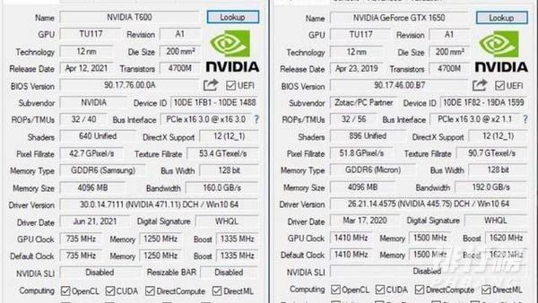 麗臺(tái)T600和GTX1650一樣采用的是TU117核心,但是相比GTX1650少了250個(gè)cuda核心,頻率也更低,不過(guò)作為補(bǔ)償T600使用的是三星GDDR6顯存,這就讓T600的顯存速度更快,也算是彌補(bǔ)了一部分因?yàn)閏uda核心數(shù)量大砍損失的性能。