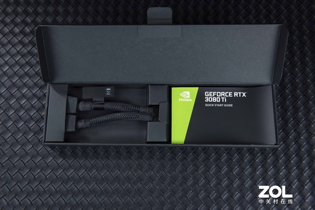 外包裝依舊是禮盒形式的,收藏感滿滿,在拿出顯卡后下方是轉(zhuǎn)接線和說(shuō)明書(shū)的配件盒,因?yàn)榇舜喂嫒圆捎脝?2pin的供電插槽,所以需要轉(zhuǎn)換成雙8pin的接口才能使用。