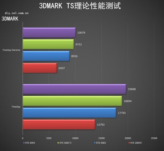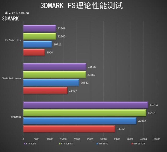 在針對(duì)顯卡DX11性能的3DMARK FS套裝測(cè)試中,我們選擇了上代和本代的4張顯卡進(jìn)行分值對(duì)比,以便能更好的反應(yīng)GeForce RTX 3080 Ti的性能水平。