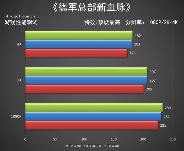 《德軍總部新血脈》并且由于自帶兩個(gè)benchmark,所以我們的數(shù)據(jù)取跑分均值,另外這款游戲幾乎每更新一次驅(qū)動(dòng)或者游戲版本升級(jí)都會(huì)導(dǎo)致分?jǐn)?shù)的巨大差異,在本次重新測(cè)試中,GeForce RTX 3080 Ti與GeForce RTX 3090的差距依舊微乎其微,而相比GeForce RTX 3080的提升約為4%左右。