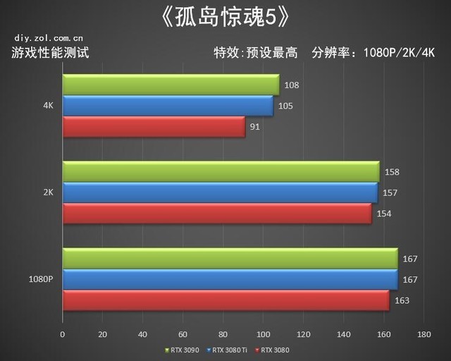 《孤島驚魂5》同樣算是優(yōu)化比較到位的3A大作,GeForce RTX 3080 Ti均能達(dá)到100幀以上的流暢運(yùn)行標(biāo)準(zhǔn),其中4K分辨率下的成績(jī)要領(lǐng)先GeForce RTX 3080 15%左右。
