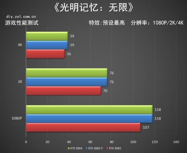 在游戲?qū)崪y(cè)中我們更印證了前面的說(shuō)法,GeForce RTX 3080 Ti和GeForce RTX 3090的大部分分?jǐn)?shù)相同,僅有1-2幀的差距。而GeForce RTX 3080的分?jǐn)?shù)差距在1080P和2K分辨率下也并不大,主要是4K分辨率會(huì)有10%左右的差距。