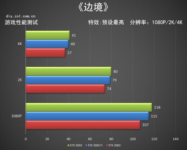 在另外一款國(guó)產(chǎn)游戲《邊境》的跑分軟件中,情況基本與《光明記憶:無(wú)限》相同,測(cè)試條件均在“RTX最高/DLSS質(zhì)量”下進(jìn)行。