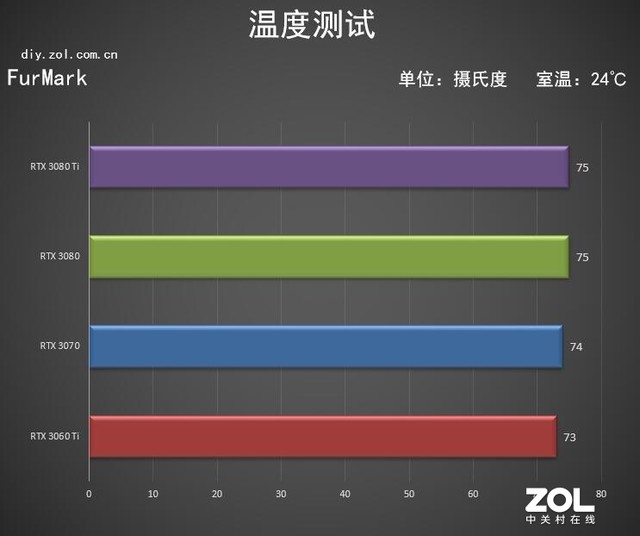 溫度方面,本次的GeForce RTX 3080 Ti經(jīng)過(guò)10分鐘左右的拷機(jī),溫度穩(wěn)定為75℃左右,與GeForce RTX 3080基本相同,并且頻率穩(wěn)定無(wú)降頻情況。