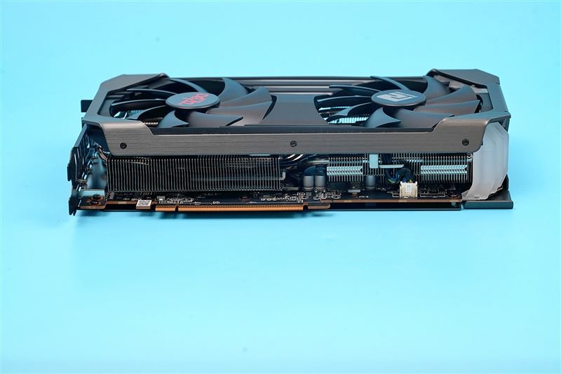撼迅RX 6600 XT紅魔顯卡第一眼給人的感覺,這就是一張非常普通的RX 6600 XT,但如果你換個(gè)角度來看顯卡的底部,就會(huì)發(fā)現(xiàn)不同,它散熱片厚度與分量達(dá)到了RX 6800非公的水準(zhǔn),而2個(gè)100mm的滾珠軸流風(fēng)扇能將風(fēng)壓提升60%。