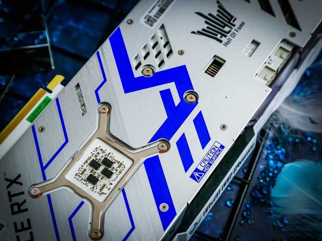 在背板上,影馳GeForce RTX 3080 Ti HOF Pro顯卡采用一體成型金屬背板,并且從鏤空的部位可以看到內(nèi)部的白色PCB版同樣采用了鏤空設(shè)計,極大限度的增加熱空氣流動性,散熱效果更強。