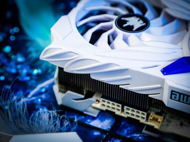 影馳GeForce RTX 3080 Ti HOF Pro顯卡正面導(dǎo)流罩采用了天使羽翼的設(shè)計理念,中間風(fēng)扇兩側(cè)分別延伸出兩對羽翼,并且在顯卡側(cè)面也有獨特的羽毛紋理。除此之外正面點綴的4個藍(lán)色裝飾塊,也讓顯卡多了些許高達(dá)的配色感覺。