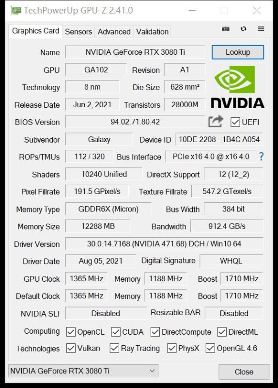 首先看一下GPU-Z的參數(shù),GeForce RTX 3080 Ti采用GA102核心,三星8nm工藝,芯片面積628平方毫米,擁有10240個CUDA,影馳GeForce RTX 3080 Ti HOF Pro的Boost頻率為1710MHz,而公版為1665MHz,有小幅提升。采用12GB GDDR6X顯存,位寬為384bit,顯存帶寬達(dá)到了912.4 GB/s,光柵單元和紋理單元為112和320。