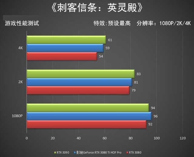在《刺客信條:英靈殿》中影馳GeForce RTX 3080 Ti HOF Pro的成績與理論測試中基本相符,由于CPU性能的限制,在1080P分辨率下三款同級別產(chǎn)品基本分?jǐn)?shù)相當(dāng),至于96幀的突出成績,可能是測出了benchmark的極限成績。不過在2K和4K分辨率下比較能反映出三款顯卡的真實水平。