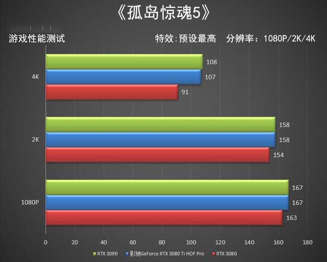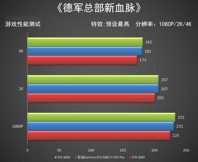 《德軍總部新血脈》并且由于自帶兩個benchmark,所以我們的數(shù)據(jù)取跑分均值,另外這款游戲幾乎每更新一次驅(qū)動或者游戲版本升級都會導(dǎo)致分?jǐn)?shù)的巨大差異,在本次重新測試中,影馳GeForce RTX 3080 Ti HOF Pro在三個分辨率下,基本與RTX 3090的成績持平,不過這款游戲?qū)τ陲@卡的要求不高,參測的三款旗艦級顯卡很難拉開差距。