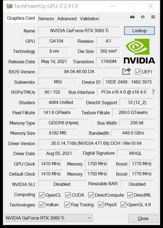 首先看一下GPU-Z的參數(shù),RTX 3060 Ti采用GA104核心,三星8nm工藝,芯片面積392平方毫米,擁有4864個CUDA,微星RTX 3060 Ti LHR雙風魔龍的Boost頻率達到了1770MHz,而公版為1665MHz。采用8GB GDDR6顯存,位寬為256bit,顯存帶寬達到了448GB/s,光柵單元和紋理單元為80和152。