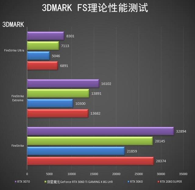 在針對顯卡DX11性能的3DMARK FS套裝測試中,微星RTX 3060 Ti LHR雙風魔龍顯卡除了FireStrike中有小幅落后,整體成績與RTX 2080 SUPER幾乎相同,并且對比RTX 3060的提升顯著,可明顯看出成績更趨近于RTX 3070。