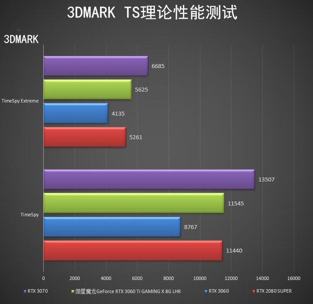 而在針對DX12環(huán)境下的Time Spy和Time Spy Extreme測試中,微星RTX 3060 Ti LHR雙風魔龍基本保持了相同的成績分布,并且在DX12中整體領先RTX 2080 SUPER更多。