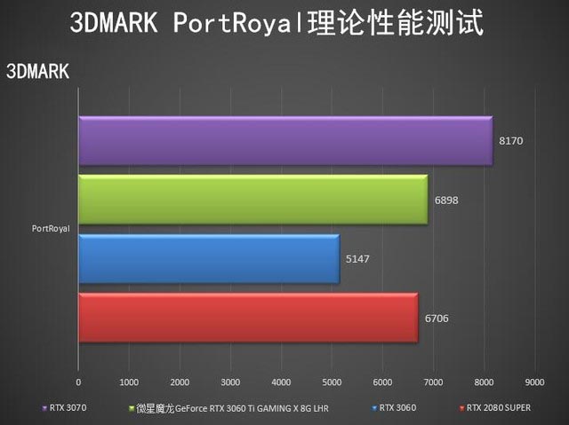 PortRoyal是3DMARK中專門針對光追性能的測試項,微星RTX 3060 Ti LHR雙風魔龍的成績相較RTX 2080 SUPER提升2%。在理論測試中,RTX 3060 Ti可以說是RTX 2080 SUPER的OC版,整體分數(shù)相差不多。