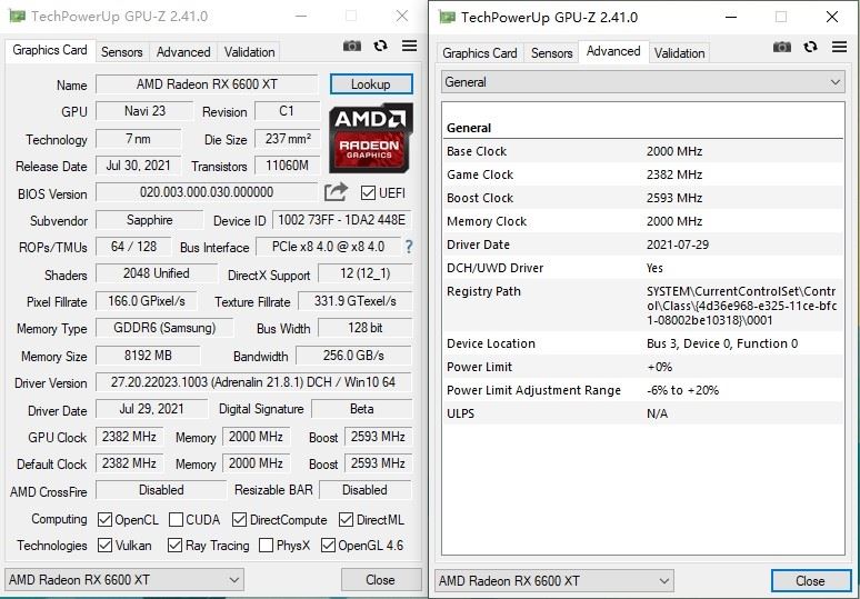 GPU-Z顯示,RX 6600 XT白金版的基礎(chǔ)/加速頻率分辨為2000MHz、2589MHz,這2個(gè)數(shù)字比公版分別高了32MHz、4MHz。