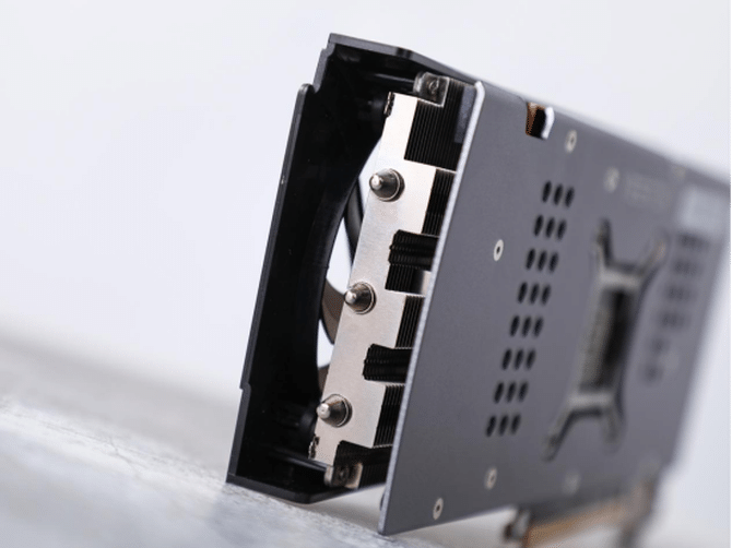 全金屬的背板設(shè)計,加上兩側(cè)的開孔,讓顯卡正面風扇的風能夠輕松穿過顯卡,帶來更好的散熱效果。標志性的顯卡核心,讓我們一眼就能看出這是一款A卡。