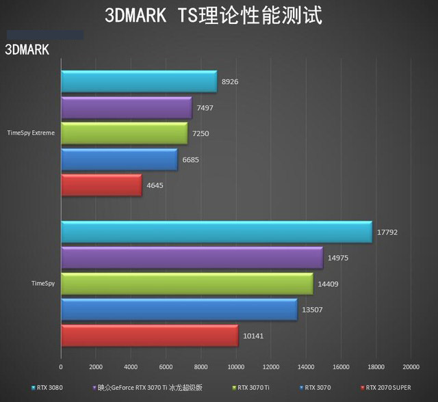 可以看到映眾GeForce RTX 3070 Ti 冰龍超級(jí)版的性能更接近GeForce RTX 3070,對(duì)比提升10%左右;對(duì)比GeForce RTX 3080的差距為16%左右;相比上一代的GeForce RTX 2070 SUPER提升46%左右。